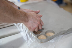 At The Maryland School for the Blind, we empower hands to explore and create. Here, fingers guide wet clay across a flat surface, using a round tool to press gentle circles into its surface. The clay slab sits securely on clear plastic laid atop a table—inviting creative expression and tactile discovery for all.