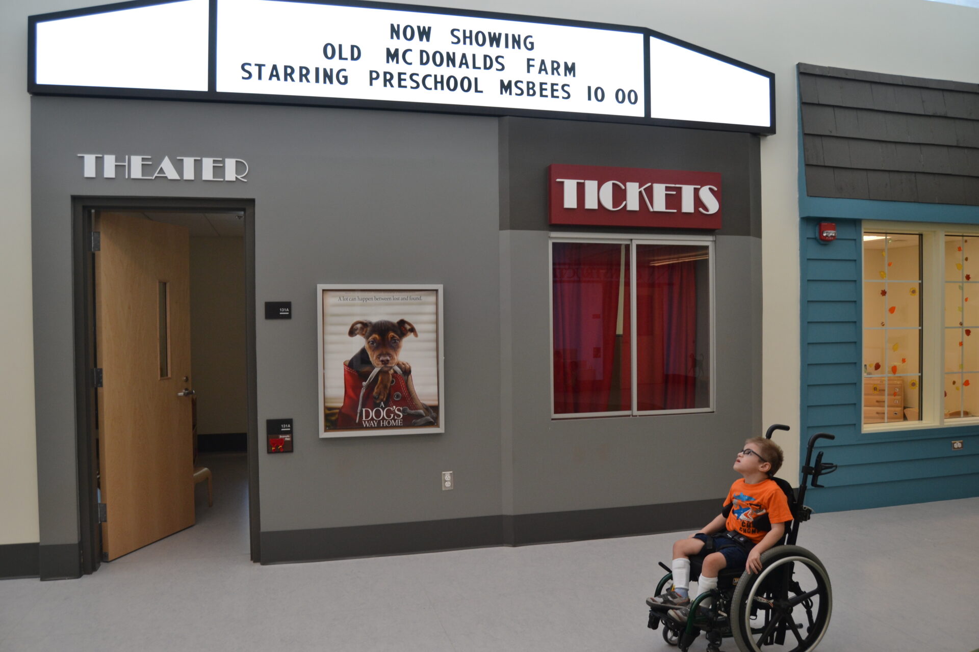 Sam in front of child sized theater